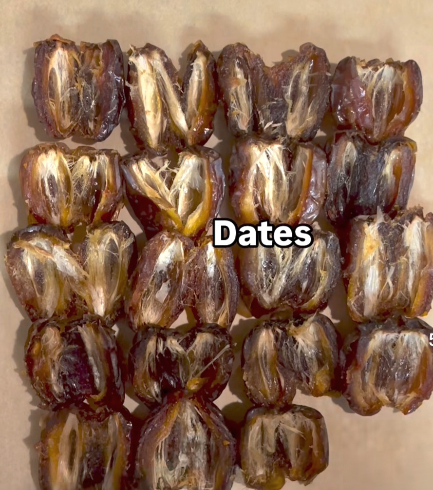 Ne siis ladotaan leivinpaperille vierekkäin ja laitetaan toinen paperi päälle. Painellaan/kaulitaan paperin päällä, jotta saadaan taatelit tasaisemmiksi ja tiiviimmäksi.
